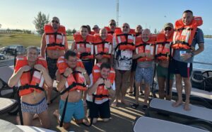 Au bateau, l'équipage de 5 personnes se présente et nous fait le brief sécurité et on fait la première photo de groupe avec nos jolis gilets de sauvetage. Ils devraient les faire en plusieurs couleurs, ce serait plus gai et l'orange ne me va pas trop au teint 😊
