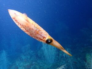 Une révélation ! Plongées étonnantes, car je ne m'attendais pas du tout à ce type de faune, aussi riche que dense. Et surtout, je retrouve mes chers "frogfishes" jaunes, rouges, experts en dissimulation – mais pas seulement ! Je suis toujours fasciné par les éternelles et magnifiques éponges barriques, tubulaires, les coraux fouets, les gorgones arborescentes. Toute la faune antillaise est bien sûr présente : langoustes, murènes, poissons-scorpions nichés sur et dans les éponges barriques que Denis se fait un plaisir de déloger. Je garde surtout le souvenir d'une inoubliable plongée de nuit, effectuée en très petit comité avec Lapin, où nous découvrîmes un banc de micro-seiches, puis de petits calamars et seiches virevoltants dans la lumière de nos lampes, des langoustes courant sur le sol, d'énormes crabes rouges invisibles de jour, de minuscules crabes des gorgones, des cigales de mer en pleine eau, etc.