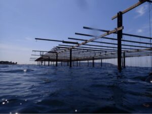 Grâce à Pons Plongée, la SCA familiale qui nous accueillait, dotée de l'autorisation de plonger dans les parcs à huîtres, nous avons pu réaliser une plongée au sein des tables ostréicoles du lycée de la mer. C'est juste merveilleux : le jeu de lumière entre les colonnes d'huîtres couvertes de vie, avec, entre autres, botrylles étoilés, blennies paon et bryozoaires spaghettis.
